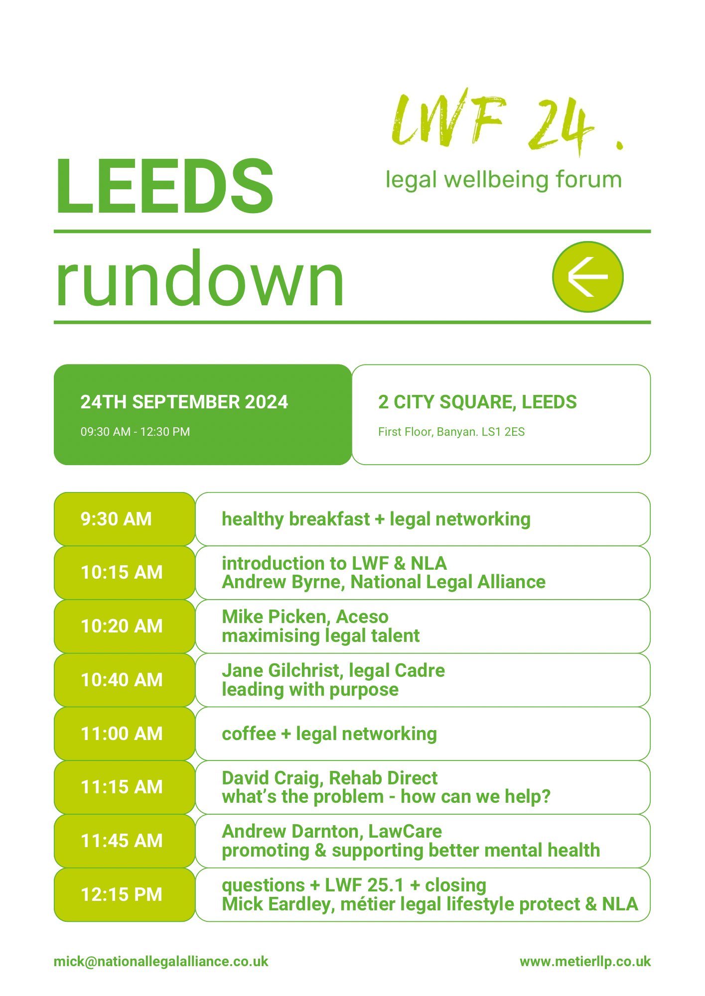 The National Legal Alliance is a support network for law firms and the launch of our wellbeing platform www.metierllp.co.uk will take that support to the next level. We wanted to go further by also creating a series of events with the focus of promoting wellbeing in the legal profession. Our Partners, that include the mental health charity LawCare that recently joined the alliance, wanted a voice to promote their commitment to this cause. The Leeds event will launch LWF and we hope the forum with be an interactive environment that will shape our future events.