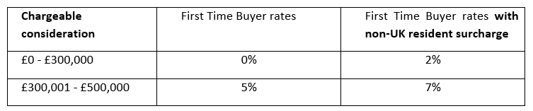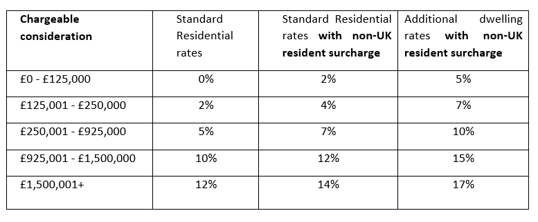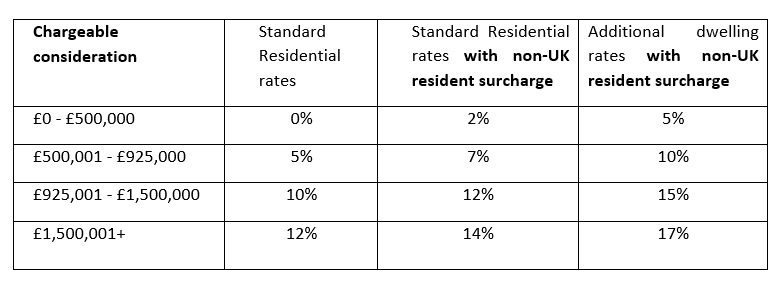How will the surcharge work? Where the purchaser will be treated as non-UK resident for SDLT purposes, the transaction will be subject to an additional 2% surcharge in each applicable band. Fortunately, the higher nil rate thresholds recently announced, as well as the First Time Buyer relief will also benefit non-UK resident buyers. Example rates tables are shared below.
