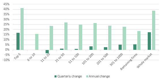 However, outside the top five, the most significant quarterly growth was seen among those firms ranked 501st or lower. In Q2, their average volume of transactions rose by 5% from the previous quarter. Year-on-year, those firms ranked 501st to 1,000th experienced 23% growth while those outside the top 1,000 recorded 19% growth.