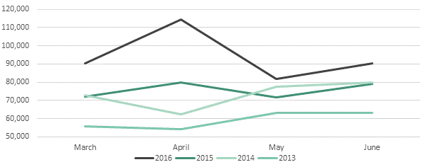 Despite an inevitable slowdown the following month, both May and June also saw year-on-year rises of 14% with firms completing 81,583 and 90,477 transactions respectively, as activity picked up again despite the uncertainty ahead of the UK’s referendum on its EU membership.