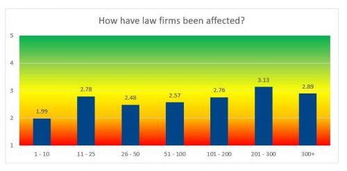 We can see from the results that smaller firms have seen the biggest reduction in business, with an average of 1.99 across all practice areas, which still, would only represent a little less business.