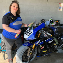 Becci Ashfield from Hudgell Solicitors working on one of the Talan Racing team’s motorbikes