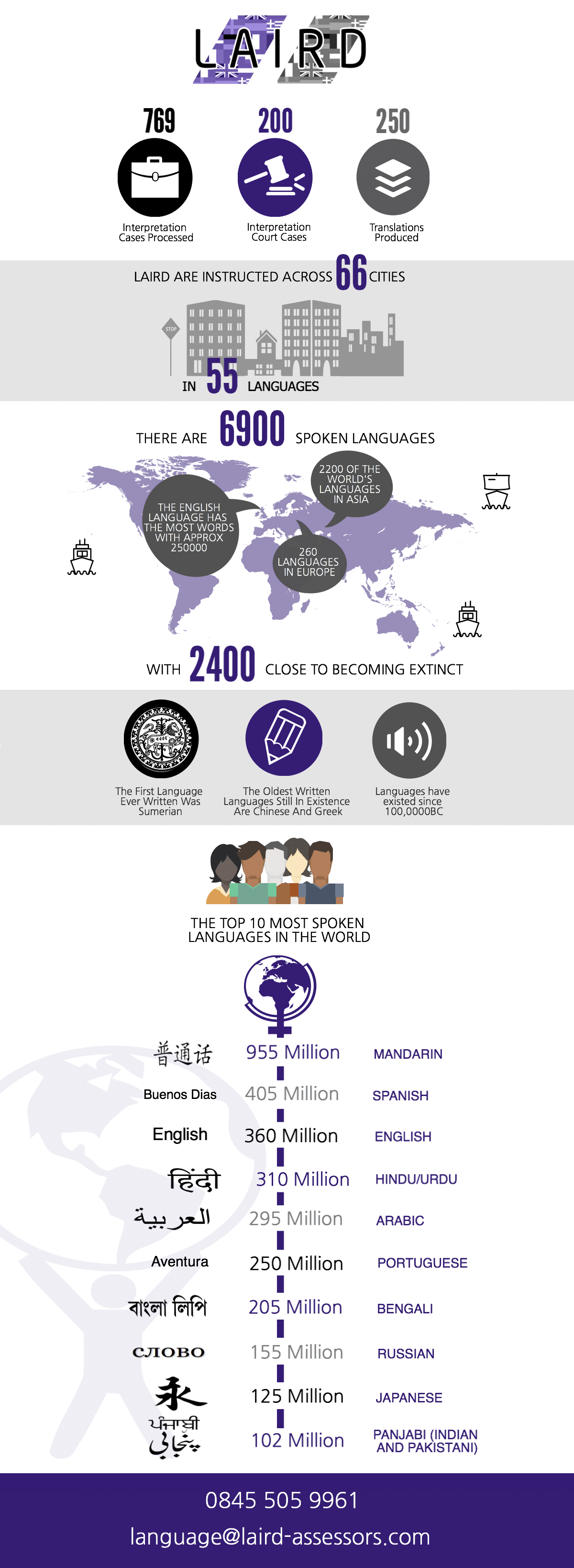 An increasing number of law firms are looking for a reliable and efficient translation company to support them with more and more cases being processed in different languages. Laird have been supporting these firms for over a year now with interpretation and translation services. They have produced the following infographic on some of their recent stats and interesting facts about languages in general.