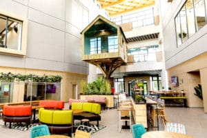 Inside, the striking 91,000sq ft building – which rivals the likes of Google and Apple’s headquarters – boasts a treehouse meeting room, its own village pub, a sun terrace and a triple height atrium with stadium seating and a restaurant offering free breakfast and fruit. Outside the development is equally impressive and surrounded by seven acres of landscaped grounds with nature trails, a duck pond and orchards with picturesque countryside views.