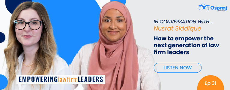 Osprey Approach announces that the latest episode of its Empowering Law Firm Leaders podcast is now available to watch and listen to on YouTube, Spotify, and Amazon Music. As the legal profession undergoes generational and cultural change, episode 31 features Nusrat Siddique, who shares insights into the realities facing junior lawyers and how firms can build environments where future leaders can thrive.
