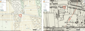 Figure shows: Historical mapping of the Site at Cedarwood Close. (left) 1895 historical mapping showing Chalkdell Wood. (right) 1935 historical mapping of the historic Brickworks at Hill End Station.