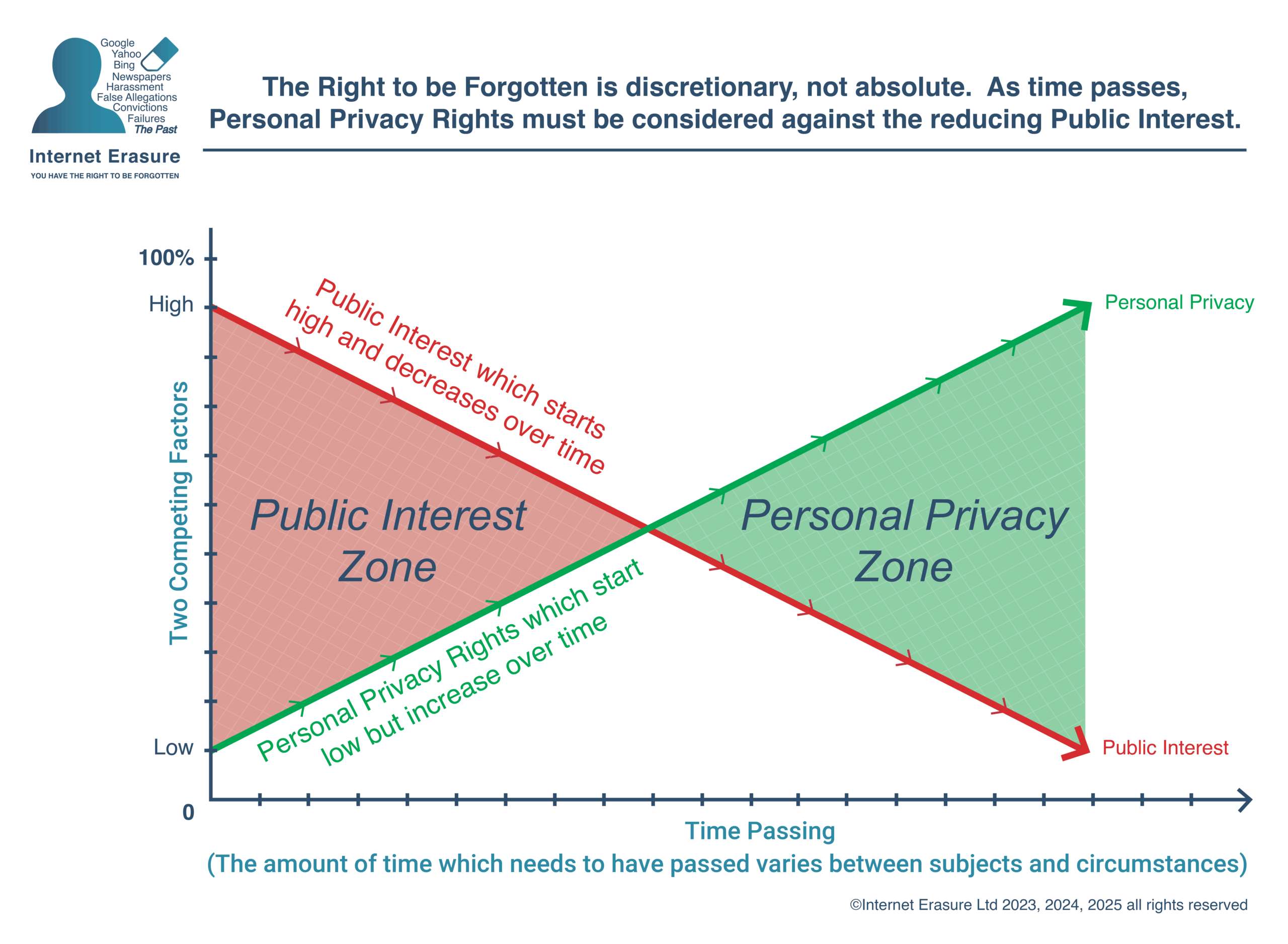 The Public Interest Zone dominates immediately after an event, when open justice, public awareness and accountability are vital. The Personal Privacy Zone grows over time as relevance fades. The crossover point is when privacy starts to outweigh public interest, which is when a Right to Be Forgotten request is most likely to succeed.