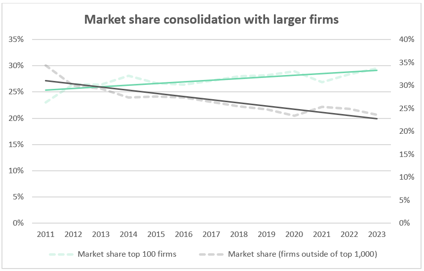 - Larger firms have slowly consolidated their market share over the last decade. The top 100 firms have gained 7% while firms outside the top 1,000 have lost 10%.