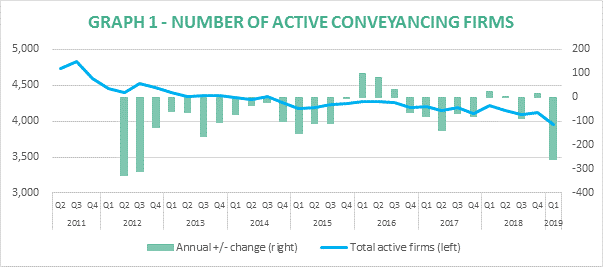- The number of active conveyancing firms in England and Wales dropped below 4,000 (3,961) for the first time on record