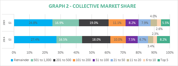 The latest data for Q1 2019 shows that the top 200 conveyancing firms now control more of the market (39.3%) than ever before. While this is a modest increase of 0.1% on Q4 2018 (39.2%), it represents a significant long-term gain from 31.9% share which the top 200 firms held back in Q2 2011.