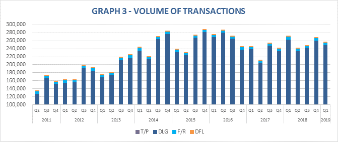 - Total quarterly conveyancing volumes in the market dipped 4% on a quarterly basis and 6% annually as Brexit uncertainty dampened transactions