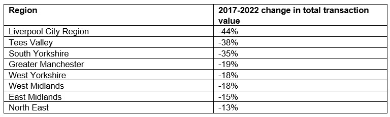 The data also showcases how far all the areas muted for Investment Zones could benefit from a boost to their local property market. Between 2017 and 2022, Investment Zone areas saw decreases in total real estate transaction values of between 13% and 44%.
