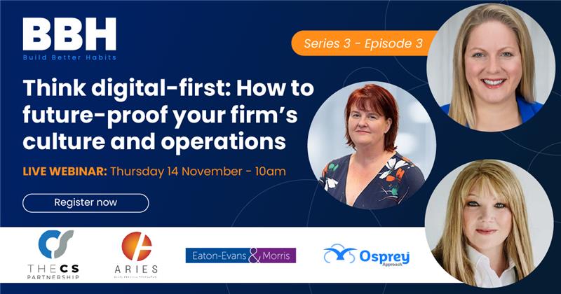The penultimate episode in the third series of Osprey Approach’s Build Better Habits webinars, will focus on how SME law firms can future-proof their culture and operations to stay competitive and successful long term.