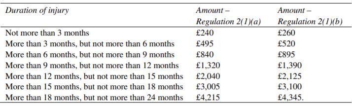 The tariff, following consultation with the Lord Chief Justice, is set out below – the second column is for where there is a minor psychological injury too. The original figures proposed for the first column were: £235, £470, £805, £1,250, £1,910, £2,790 and £3,910.